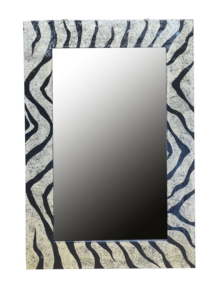 The Zebra Print mirror has an exqusite Mother of Pearl like finish. It is such a great size for a bathroom, living room or study above a table or desk.